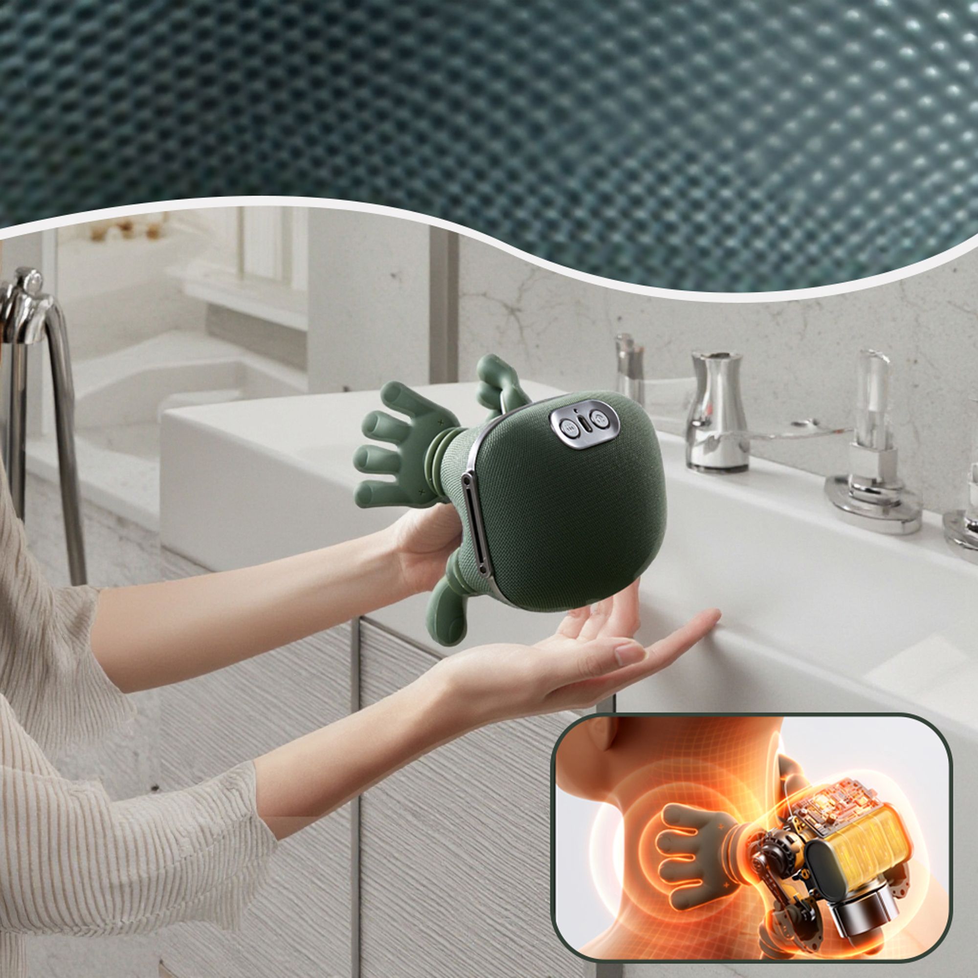 زاوية تدليك عميق: يحاكي يد الإنسان ويوصل للعضلات بعمق الحرارة المريحة: يوفر دفء يريح العضلات والمتاعب بسرعة